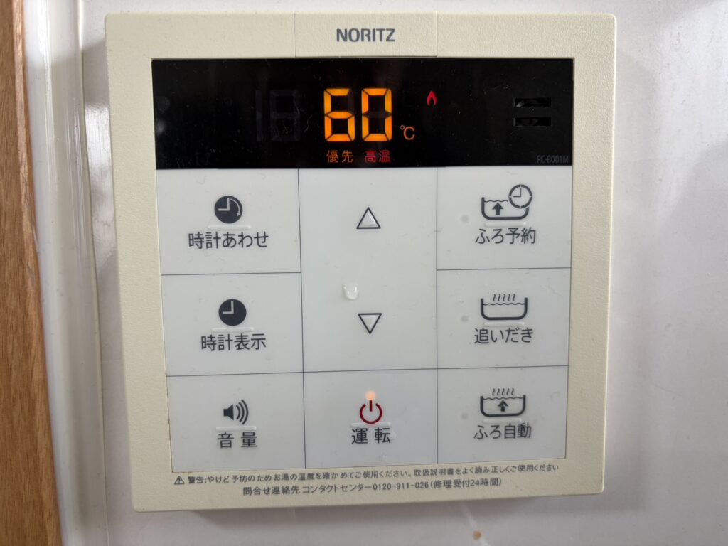 給湯器の壁掛けリモコンを60度に設定します。